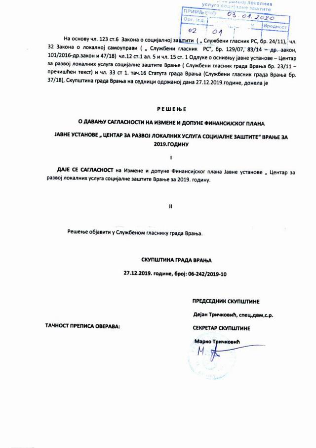 ОДЛУКА УСВАЈАЊА ПРОГРАМА ПОСЛОВАЊА СА ФИНАНСИЈСКИМ ПЛАНОМ ЗА 2020.ГОДИНУ